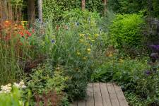 Den mjuka gången av lärk leder oss vidare till nya vilda blomsterbäddar där färgskalan är mildare och går i rosa, vitt och blått. Här växer resliga tuvrör, ståtlig rosenflockel, rosa temynta, jätteverbena, rysk martorn och kransveronika i ett härligt insektssurr bland fladdrande fjärilar. Den lilafärgade anisisopen drar till sig extra många blomflugor, vildbin och fjärilar. En murken trädstam hjälper också till att skapa ett bra mikroklimat för de bevingade vännerna. På några ställen syns Austinrosen Olivia som ser ut att trivas utmärkt i sandjorden.